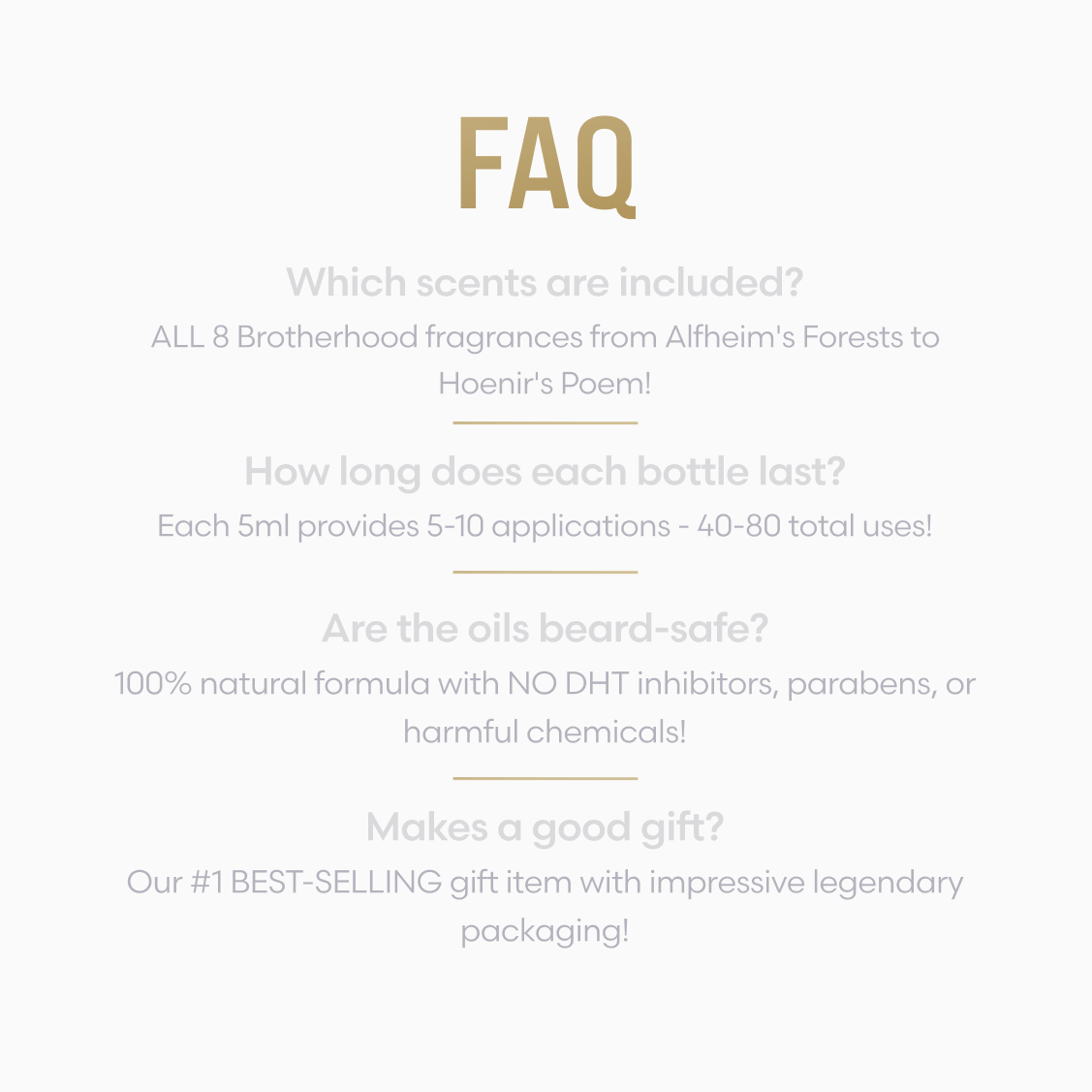 Discover 8 bold, cologne-grade fragrances—each inspired by Norse legends and packed in a 5ml Night Liquid Elixir bottle (40ml total). Find your favorite or switch it up daily—your beard will thank you.